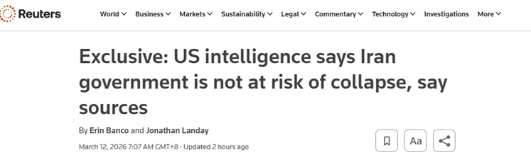 FX168财经报社(亚太)讯 英国路透社周三(3月11日)发布独家报道称,据三位知情人士透露,美国情报显示,在美国和以色列近两周持续不断的轰炸之后,伊朗领导层整体上仍然基本完整,短期内并不存在垮台风险。