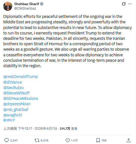 FX168财经报社(北美)讯 在特朗普对伊朗设定的最后通牒逼近之际,巴基斯坦总理夏巴兹·谢里夫周二(4月7日)紧急呼吁美国总统特朗普将最后期限延长两周,同时敦促伊朗在此期间重新开放霍尔木兹海峡,作为缓和局势的“善意姿态”。