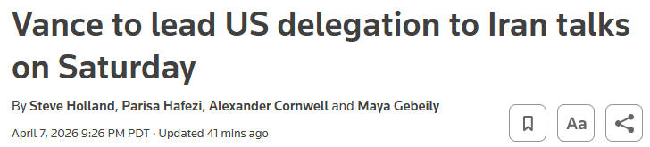 白宫周三(4月8日)表示,美国总统特朗普已派出由副总统万斯(JD Vance)、总统特使威特科夫和女婿库什纳领衔的谈判团队前往巴基斯坦首都伊斯兰堡,与伊朗展开新一轮谈判。首轮会谈预计将于周六举行。