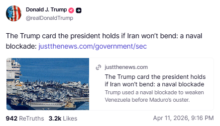 特朗普转发的文章来自 Just the News,标题为: “The Trump card: President holds if Iran won’t bend - naval blockade (特朗普手中的王牌:如果伊朗不让步,总统仍握有一张牌——海上封锁)”