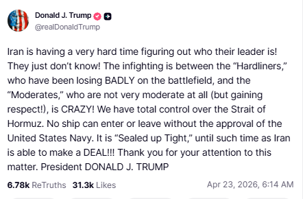 特朗普当天在Truth Social上发文称:“伊朗现在正非常艰难地试图弄清楚谁才是他们的领导人!他们自己都不知道!‘强硬派’在战场上输得一败涂地,‘温和派’其实一点都不温和,但正赢得尊重,双方之间的内斗简直疯狂!”与此同时,特朗普还表示,他正在等待伊朗方面提出一份“统一”的停战方案。