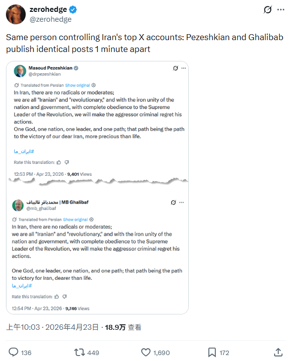 两人在帖文中写道:“在伊朗,没有激进派,也没有温和派。”