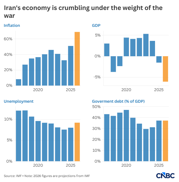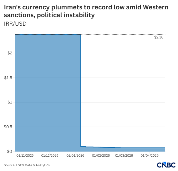 国际货币基金组织(IMF)在其《世界经济展望》中预计,伊朗经济将在2026年萎缩6.1%,通胀率将高达68.9%。与此同时,伊朗汇率已跌至约132万里亚尔兑1美元。