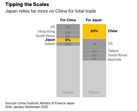 北京本周加大对东京的施压力度:先是禁止所有可能用于军事用途的两用物项对日发货——这可能会波及中国对日出口中估计约40%的份额——并威胁对支撑日本汽车产业的稀土实施更严格的管制。数小时后,中国又对一种关键的芯片制造材料发起反倾销调查,瞄准了日本工业的另一根支柱。