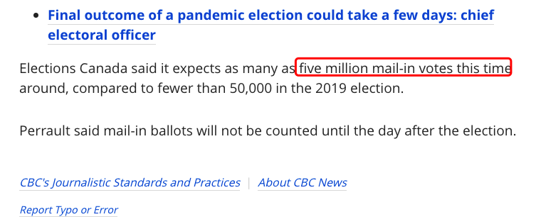 加拿大选举事务处 (Elections Canada)更表示,预计这次大选的邮寄选票将多达 500 万张。而 2019 年大选时,只有不到 5万人采用这个方式投票。