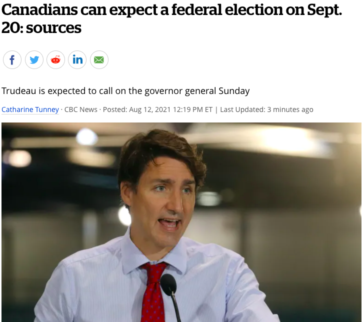 FX168财经报社(北美)讯 据加拿大乐活网周四(8月12日)援引CBC消息,加拿大将在9月20日举行联邦大选,选民有望在当天前往投票站投选票。加拿大政府内部的知情人士亦透露,加拿大总理特鲁多计划周日访问加拿大总督府(Rideau Hall),请求总督解散议会,召集大选。
