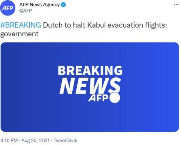“荷兰今天被美国告知必须要离开了,并且将很可能在今天晚些时候运行最后的撤离航班。”荷兰外交大臣、国防大臣在致议会的一封信中写道。