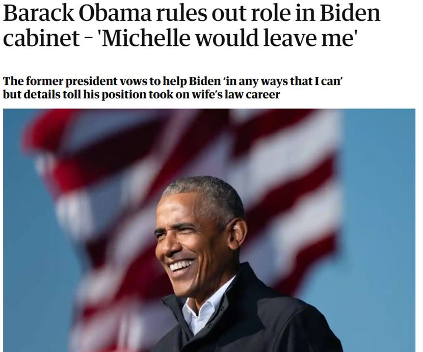 FX168财经报社(香港)讯 当地时间11月15日,美国前总统奥巴马排除了在乔·拜登的内阁中担任任何正式职务的可能性。