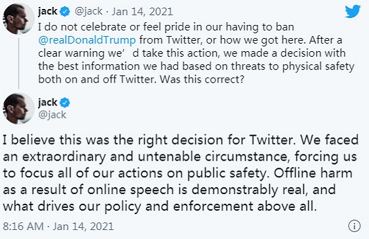 多尔西也指出,禁言特朗普在一定程度上是推特的失败,该公司在促进其平台上的“健康对话”方面做得不够。
