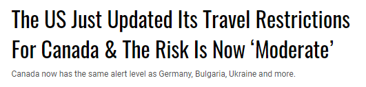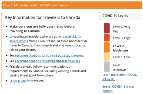 10日当天,美国疾控中心(USCDC)宣布将加拿大的新冠旅行建议从原来的3级调至2级,从原来的“高风险”变为“中等风险”——现在,在美国眼里,加拿大的疫情风险和德国、捷克、埃及、萨尔瓦多、巴基斯坦等国处于同一等级。