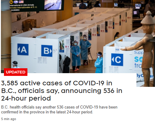 8月11日,BC省24小时新增病例536例,活跃病例达3585人。