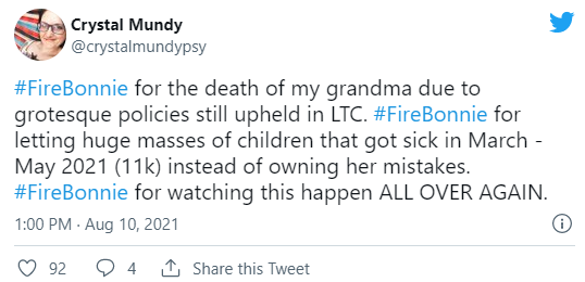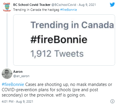 于是,8月9日晚,一个名为#fireBonnie(#开除Bonnie)的话题瞬间在推特上火了起来,带有相关话题的推文内,满满都是对BC省防疫政策和Bonnie Henry博士的失望。