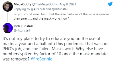 “教育你们这帮反口罩的傻X是卫生官的事,但很明显她失败了。口罩是有用的,不然你给我解释一下,为什么强制口罩令一取消,新冠病例就上涨了10%?#开除Bonnie”