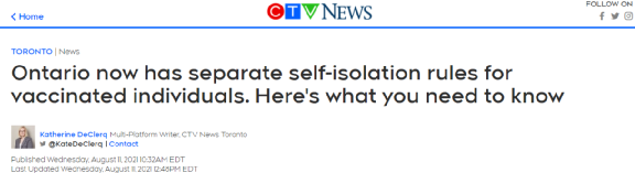 此外,8月11日,安大略省还更新了该省的隔离措施——对于在接触病毒前14天没有接种或没有完全接种疫苗的人,暴露发生后应立即接受检测,且无论检测结果如何,都应自我隔离10天,并建议在自我隔离第7天或之后再进行一次测试。