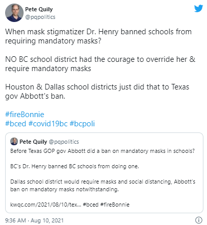 “就是Henry博士把戴口罩污名化的。现在整个BC省没有一个学区胆敢违抗她的命令。#开除Bonnie”