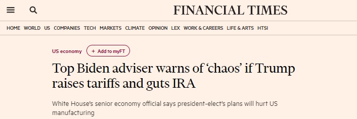 FX168财经报社(亚太)讯 英国《金融时报》周日(11月24日)报道称,白宫首席经济顾问表示,如果特朗普(Donald Trump)放弃总统拜登(Joe Biden)的制造业税收抵免政策,并按计划提高关税,他将引发一段“混乱时期”和价格大幅上涨。