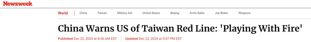 FX168财经报社(亚太)讯 美国《新闻周刊》周日(12月22日)报道称,中国外交部周日表示,美国向台湾提供数百万美元军事援助是在“玩火”,并警告称此举“会让美国自食其果”。