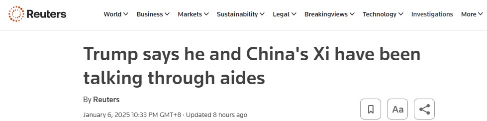 美国当选总统特朗普当地时间12月16日曾表示,中国和美国可以共同努力“解决世界上的所有问题”。他并表示,与中国国家主席习近平进行了“非常好的对话”。