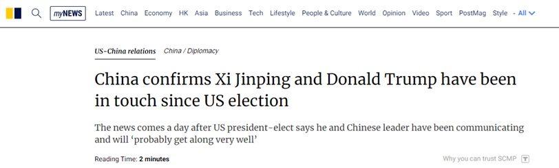 FX168财经报社(亚太)讯 香港《南华早报》周二(1月7日)报道称,中国首次证实,在本月就职典礼之前,中国国家主席习近平一直在与美国当选总统特朗普(Donald Trump)进行沟通。