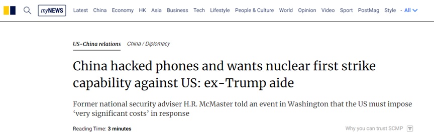 麦克马斯特表示,他得出的结论是,根据中国正在做的事情判断,中国正准备拥有针对美国的先发制人打击能力,“从网络的角度来看,中国至少正在发展一种潜在的能力,可以摧毁我们的通信网络,并大规模加强战略力量”。