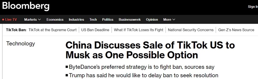 中美重磅!彭博:中国官员正讨论将TikTok美国业务出售给马斯克的可能性