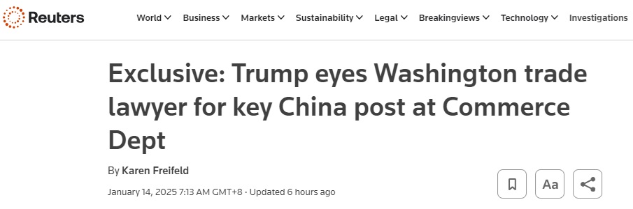 FX168财经报社(亚太)讯 英国路透社周二(1月14日)发布独家报道称,据知情人士透露,美国当选总统特朗普(Donald Trump)正在考虑任命华盛顿知名贸易律师杰弗里·凯斯勒(Jeffrey Kessler)领导美国商务部工业和安全局(BIS),路透社称,这是美中科技战中的一个关键职位。