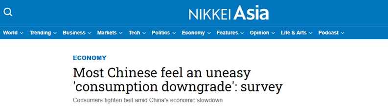 日本《日经亚洲》(Nikkei Asia)周四报道称,一项新的调查显示,80%的中国消费者认为他们已经陷入“消费降级”,这一调查突显了中国经济放缓之际消费者信心的低迷。
