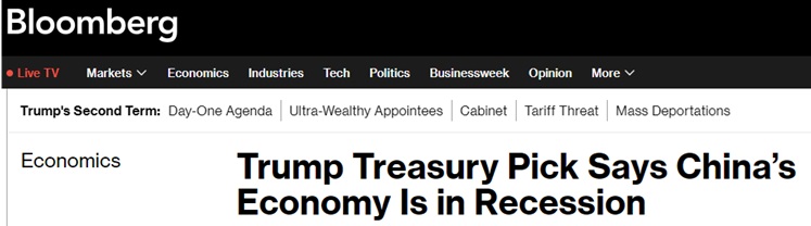 FX168财经报社(亚太)讯 美国当选总统特朗普(Donald Trump)提名的财政部长斯科特‧贝森特(Scott Bessent)当地时间周四(1月16日)表示,中国经济即使不是处于萧条,也已经陷入衰退,并正试图通过出口摆脱困境。