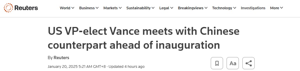 FX168财经报社(亚太)讯 英国路透社周一(1月20日)最新报道称,美国候任副总统万斯(JD Vance)当地时间周日会见了中国国家副主席韩正,万斯和美国当选总统特朗普(Donald Trump)将在一天后宣誓就职。