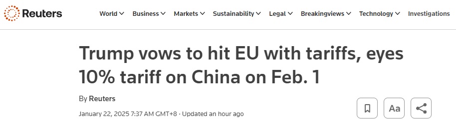 FX168财经报社(亚太)讯 美国总统特朗普(Donald Trump)当地时间周二(1月21日)表示,他的团队正在讨论对中国征收10%的关税,该关税最早可能于2月1日生效。