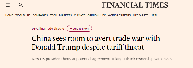 FX168财经报社(亚太)讯 英国《金融时报》周三(1月22日)报道称,美国总统特朗普(Donald Trump)并未如竞选时所威胁的立即对中国商品征收60%关税,令北京方面希望有可能通过谈判避免第二次贸易战。