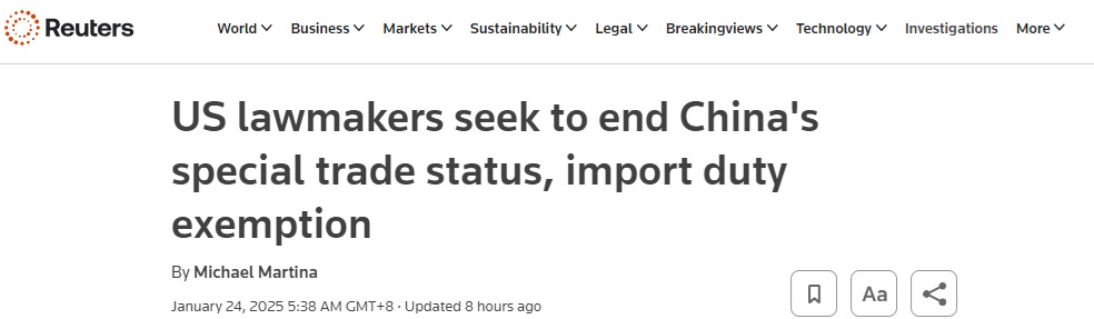 FX168财经报社(亚太)讯 英国路透社周五(1月24日)报道称,美国国会议员当地时间周四提出了一项两党法案,该法案将撤销中国在美国的优惠贸易地位,分阶段征收高额关税,并结束对中国低价值进口产品的“小额豁免”免税待遇。