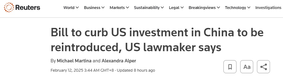 FX168财经报社(亚太)讯 英国路透社周三(2月12日)报道称,美国众议院“中国问题特别委员会”主席约翰·莫伦纳尔(John Moolenaar)当地时间周二表示,国会将重新提出限制美国对华投资的法案,并补充说,该法案去年未能通过成为法律不是因为亿万富翁埃隆·马斯克(Elon Musk)的反对。