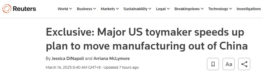 FX168财经报社(亚太)讯 英国路透社周五(3月14日)发布独家报道称,在美国总统特朗普(Donald Trump)与中国的贸易战愈演愈烈的背景下,沃尔玛(Walmart)和塔吉特(Target)的一家主要玩具供应商,正在加速撤离中国,重新调整生产布局。