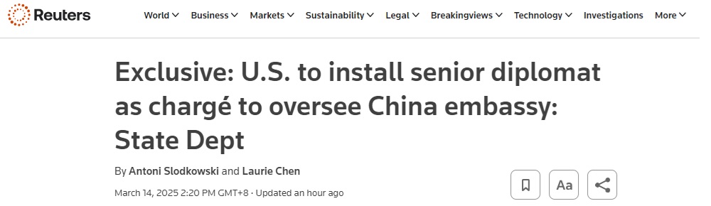 中美突发!路透独家:美国将任命高级外交官来管理驻华使领馆事务
