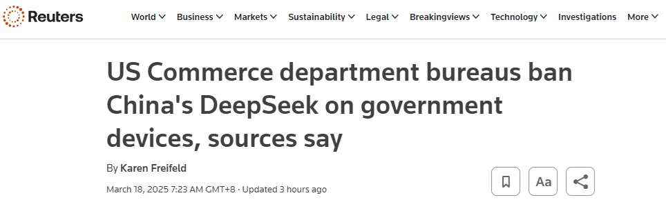 FX168财经报社(亚太)讯 英国路透社周一(3月17日)报道称,根据路透社和两名知情人士看到的消息,美国商务部各部门最近几周通知工作人员,中国人工智能(AI)模型DeepSeek已被禁止在其政府设备上使用。