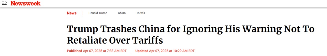 特朗普在“真相社交”发文称:“如果中国不在4月8日之前撤回其在长期贸易侵害之外再加征的34%关税,美国将从4月9日起对中国商品额外加征50%的关税。此外,所有有关中方请求与我们会谈的对话将被终止!与此同时,美国将立即启动与其他提出会谈请求的国家的谈判。”