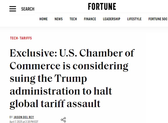 FX168财经报社(亚太)讯 美国知名财经杂志《财富》(Fortune)当地时间周一(4月7日)发布独家报道称,两位直接了解讨论情况的消息人士向《财富》杂志表示,美国商会正考虑对美国总统特朗普的政府提起诉讼,以阻止特朗普将于周三生效的新关税的实施。