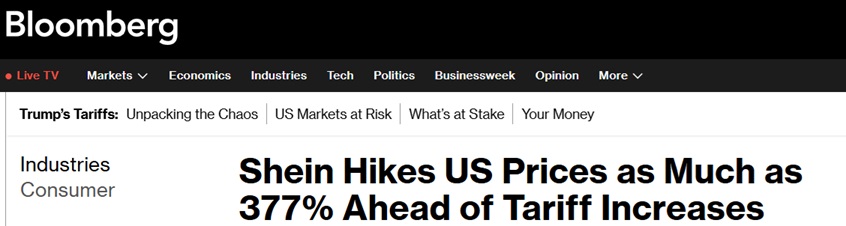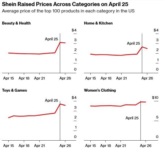 就在4月21日,美国总统特朗普还在社交媒体上表示,由于能源和食品杂货价格下跌,“几乎没有通货膨胀”。但彭博社指出,Shein的涨价反映了中国在线零售商试图将至少部分额外的进口成本转嫁给美国消费者的最新努力。