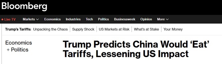 特朗普周二在接受美国广播公司新闻网(ABC News)采访时表示:“不清楚中国会不会自行吸收关税(eat it),中国可能会吸收这些关税。”