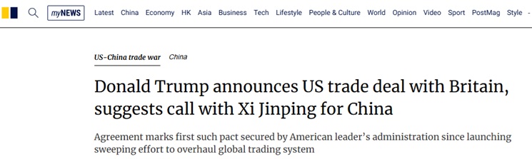 FX168财经报社(亚太)讯 香港《南华早报》周五(5月9日)报道称,美国总统特朗普(Donald Trump)周四公布了与英国的新贸易协定,称其为他希望与中国达成的“公平”协议的典范,并暗示即将与中国国家主席习近平通话,且对中国商品的关税“可能”会降低。