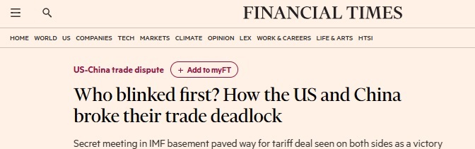 英国《金融时报》指出,此次此前未曾报道的会晤,是美国总统特朗普(Donald Trump)重返白宫与发动关税战以来,美中官员首次举行高层会晤,并促成贝森特与中国国务院副总理何立峰上周末在瑞士日内瓦会面与同意停火,将各自的关税下调115%、为期90天。
