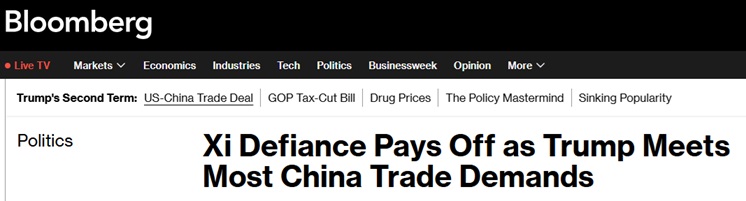 彭博社指出,该协议最终几乎满足了北京方面的全部核心诉求。特朗普于4月2日宣布对中国加征的34%“对等”关税已被暂停执行——这意味着美国最大的竞争对手中国将与包括英国在内的所有国家一样,享受10%的关税。英国是美国的长期盟友,上周与美国达成了协议。