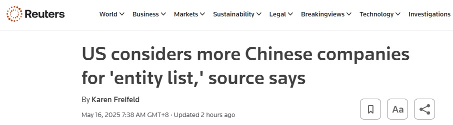 路透社称,企业之所以被列入“实体清单”,通常是因为其行为被认为有害于美国国家安全或外交政策利益。