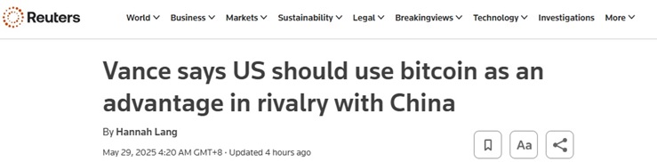 FX168财经报社(亚太)讯 英国路透社周四(5月29日)报道称,美国副总统万斯(JD Vance)当地时间周三表示,中国对比特币的警惕应该会促使美国拥抱全球最大的加密货币,并巩固其在数字资产领域的战略优势。