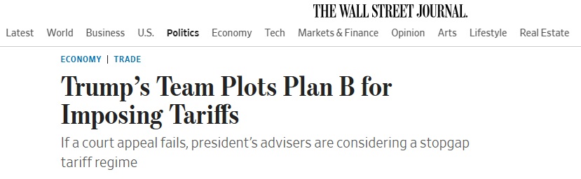 FX168财经报社(亚太)讯 美国《华尔街日报》当地时间周四(5月29日)报道称,特朗普(Donald Trump)团队考虑关税B计划,考虑根据贸易法条款征收权宜之计关税,该计划允许在150天内实施最高15%的关税。