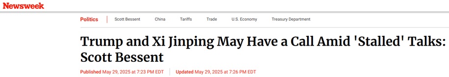 FX168财经报社(亚太)讯 美国《新闻周刊》当地时间周四(5月29日)报道称,在美国总统特朗普(Donald Trump)发动关税战的背景下,美国财政部长贝森特(Scott Bessent)周四表示,美国与中国的贸易谈判“有点停滞”,特朗普和中国国家主席习近平可能很快会通电话。