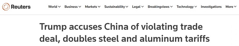 FX168财经报社(亚太)讯 美国总统特朗普(Donald Trump)当地时间上周五(5月30日)指责中国违反了一项旨在降低关税的双边协议,并宣布将把全球钢铁和铝关税翻倍至50%,这再次扰乱了国际贸易。