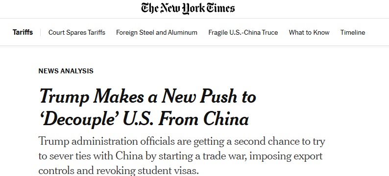《纽约时报》称,总而言之,特朗普政府的这些行动相当于一场激进的“脱钩”运动,试图切断世界两大经济体之间密切的商业联系,并摧毁几十年来两国关系的支柱。