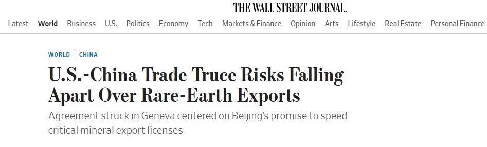 《华尔街日报》称,然而,自日内瓦会议以来,北京方面继续拖延稀土和其他制造汽车、芯片及其他产品所需元素的出口许可证审批。